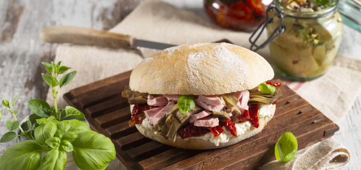 - Bułkę przekrój wzdłuż, ale nie do końca, tak aby móc wkładać do niej składniki. Karczochy i suszone pomidory pokrój w kostkę.