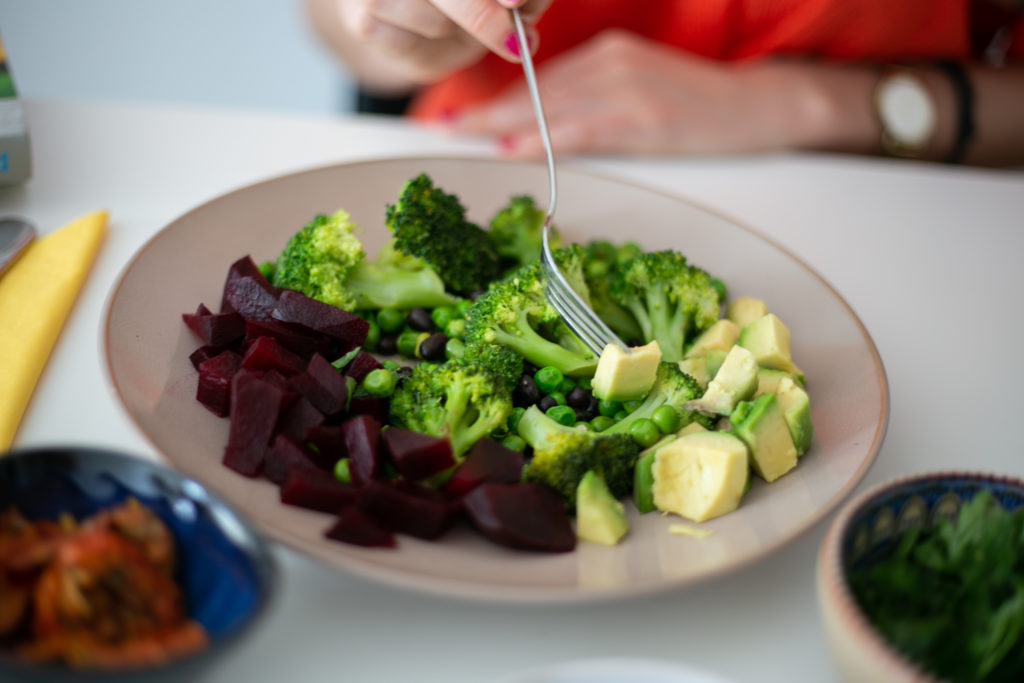 Bilans dnia do tej pory wygląda super: produkty z różnych grup, tj. jaja, produkt mleczny, orzechy, owoc, warzywa, tłuszcze roślinne. Teraz już wiem, że na kolację, która zazwyczaj jest u mnie bardzo lekka, mogę zjeść rybę lub mięso, choć rzadko to robię. Tego dnia zdecydowałam się na moje ukochane rośliny strączkowe. Jestem do nich przyzwyczajona, nie objadam się wielkimi porcjami, więc nawet skonsumowane wieczorem nie spowodują żadnych negatywnych efektów, co by mogło się wydawać. Tak więc: kolejna porcja warzyw (bardzo często burak i brokuł), natka pietruszki, groszek zielony (nigdy konserwowy, a mrożony), ugotowana wcześniej czarna fasola i oliwa z oliwek extra vergine. Do tego liofilizowane pomidory, parę pestek dyni, a nawet migdałów, a wszystko przyprawione różową solą i świeżym pieprzem. Tego dnia pozwoliłam sobie powtórzyć awokado, a w zasadzie drugą połowę, z racji tego, że pierwszą spałaszowałam rano.