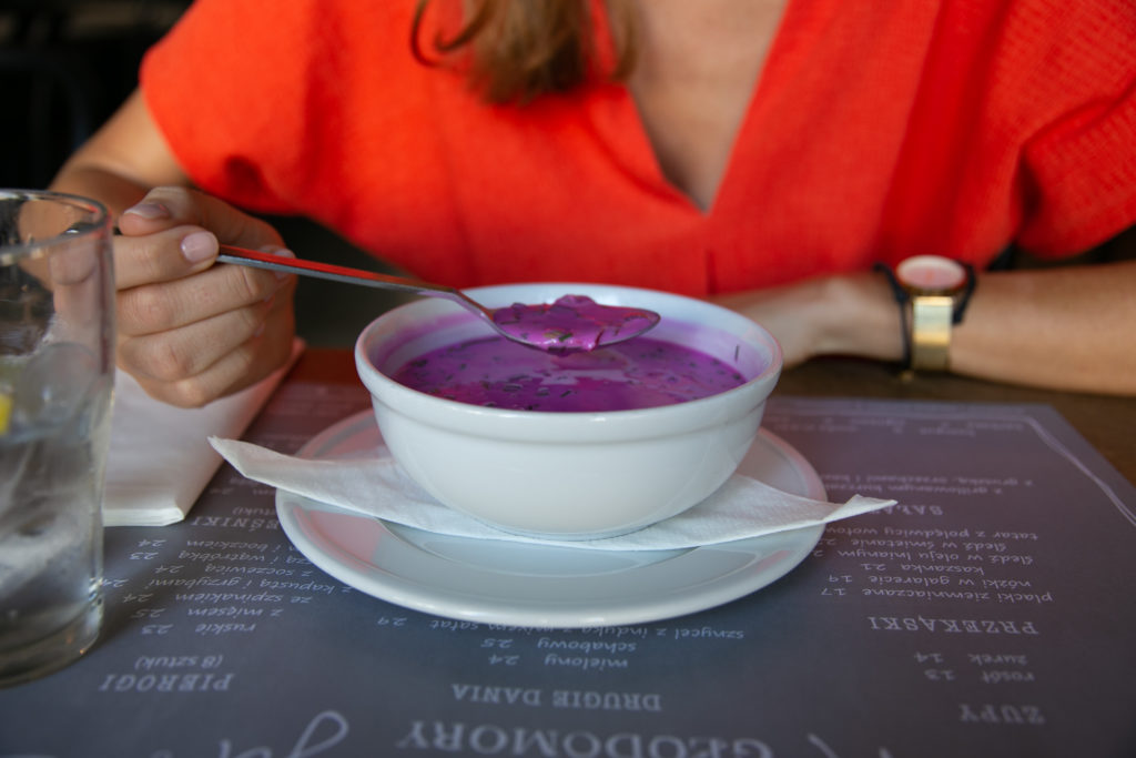 Przeważnie trzy godziny po takiej przekąsce mój żołądek już wie, że ma mi zasygnalizować komunikat OBIAD. Tego dnia było bardzo gorąco, apetyt średnio mi dopisywał i nie miałam ochoty na nic ciepłego, więc przy okazji spotkania, wiedząc też, że nie mam za wiele czasu, w restauracji Głodomory zamówiłam kojący chłodnik z burakami, który uwielbiam. Jest sycący, bardzo smaczny i odżywczy. Zawsze dopytuję na jakiej bazie został przygotowany. I ten okazał się moim ideałem, bo do jego bazy użyto maślanki!