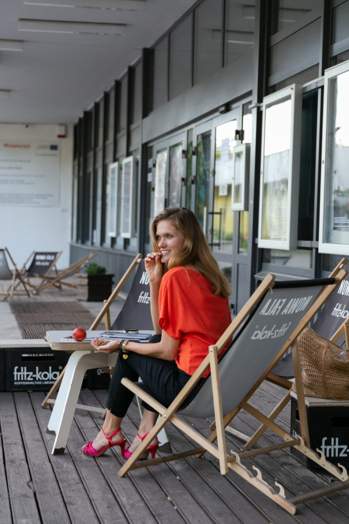 Akurat w ostatnim czasie i kiedy postanowiłam uwiecznić mój dzień pod względem jedzenia, byłam w biegu. W takiej sytuacji nie noszę ze sobą pudełek, a wpadam do sklepu, kupuję tzw. coś, latem czy wiosną siadam w spokojnym miejscu i przeznaczam 10 minut na skonsumowanie mojej przekąski, bo taką rolę spełnia. Tutaj – nektarynka, jako sezonowy owoc i garść orzechów nerkowca. To moje ulubione połączenie, które jest odpowiednie między I śniadaniem a lunchem, czy obiadem. Gdybym zjadła sam owoc, za chwilę musiałabym dojeść coś jeszcze. Dlatego cukry proste (owoc) zawsze łączę z czymś tłustym (orzechy, nasiona, ziarna) lub białkowym (naturalny jogurt pitny lub kefir). Tym razem kursowałam po warszawskim Żoliborzu, więc przysiadłam chwilę koło kina Elektronik, gdzie przeczytałam internetowe newsy i posiliłam się szybko.