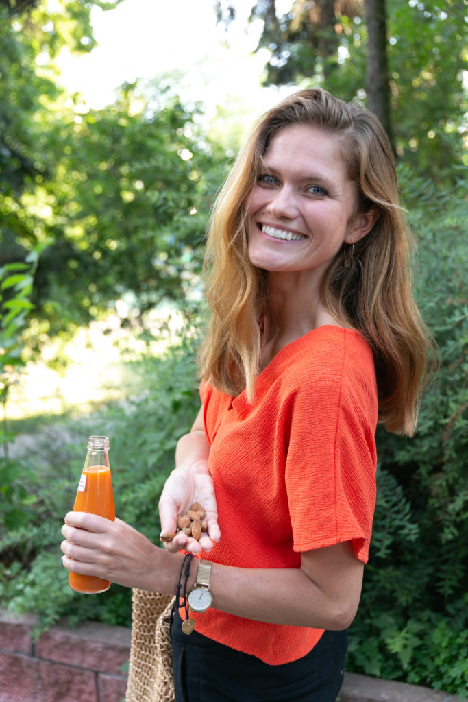 Z uwagi na to, że dalszy ciąg dnia wyglądał podobnie pod względem zajętości i braku czasu na przyrządzenie czegoś w domu, ani na dłuższą celebrację tej chwili w ulubionym miejscu, postanowiłam kupić sok marchwiowy i połączyć go z migdałami. Ta sama zasada co I przekąska: jeśli cukier prosty, tutaj z marchwi to w towarzystwie czegoś tzw. „wyciszającego”, czyli tłuszczu i jednocześnie extra dawki substancji mineralnych. Tym razem nie miałam chwili usiąść, jedynie zapozować do zatrzymania tego momentu. Nie chciałam też bardzo się najadać, gdyż biegłam na zajęcia baletowe…